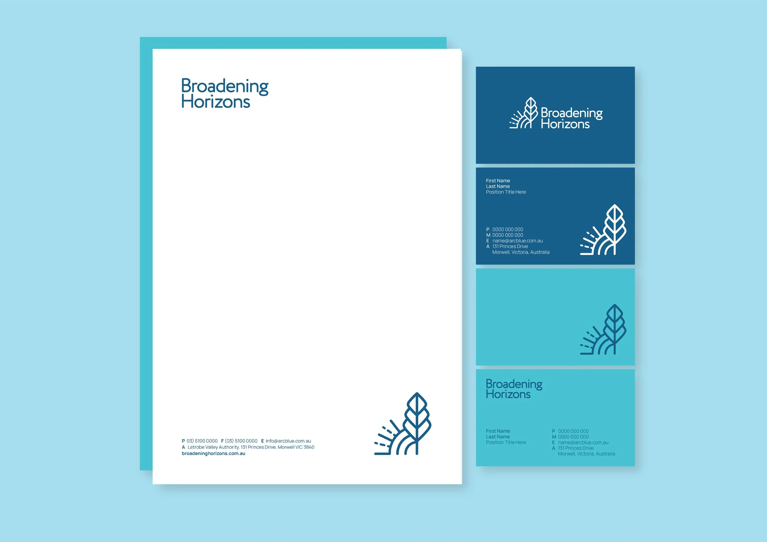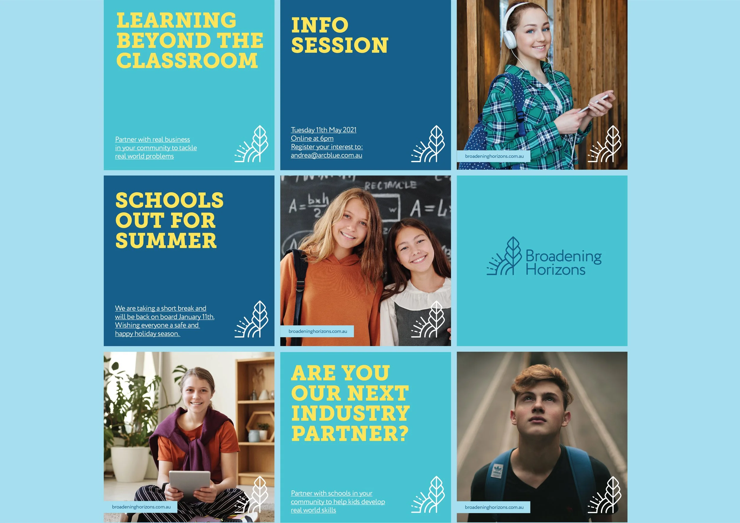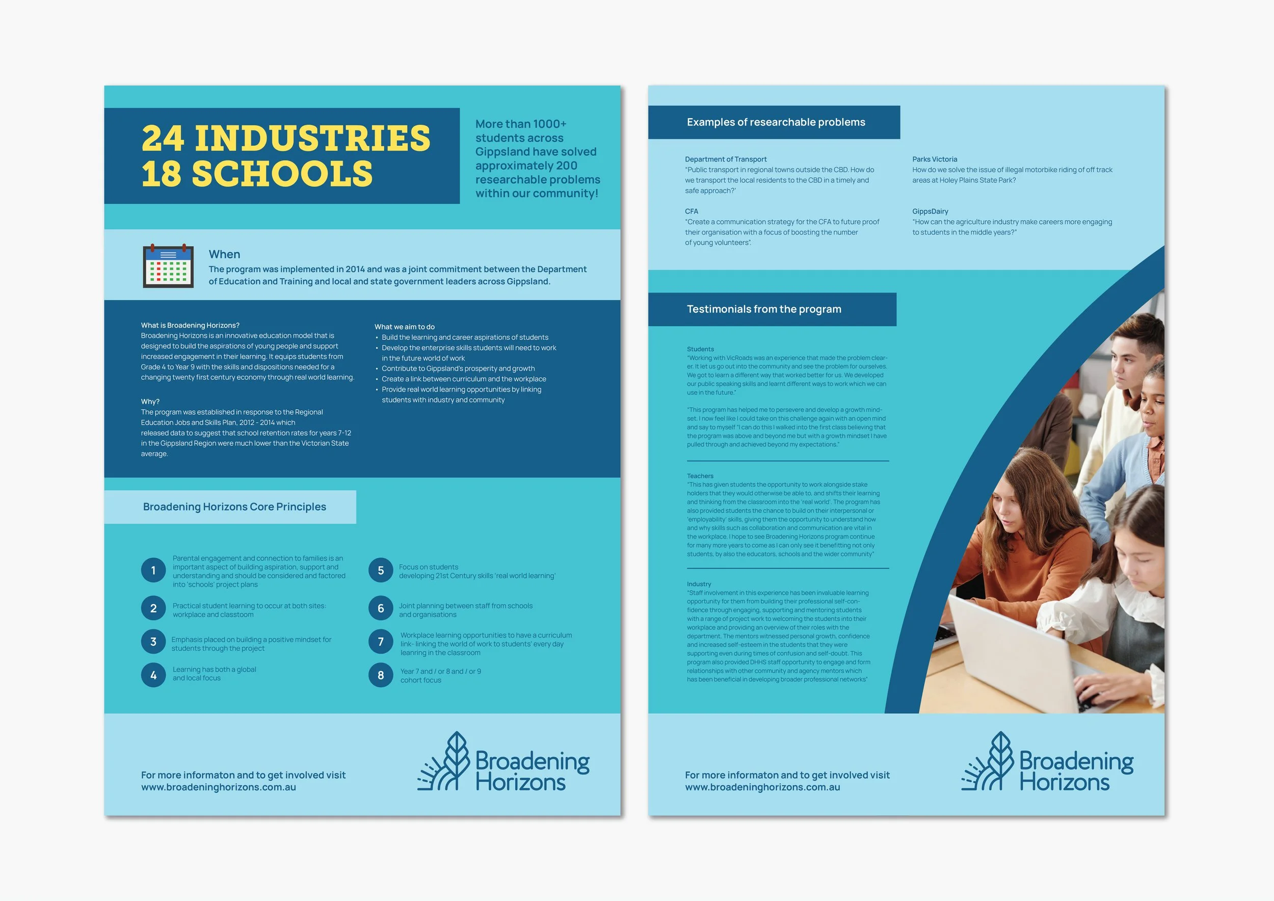Broadening Horizons (BH) is an education innovation program in Gippsland which facilitates schools with industry partners in order to create real life learning for students. Their original logo was co designed by students when the program began but an overall brand was never created meaning across all mediums a consistency lacked. BH wanted to keep the meaning of the original logo but modernise it as well as creating a consistent brand for ongoing use. The original logo consisted of the following elements: Hands (partnership), Tree (growth) and the Sun (aim of program). These elements were re invented to create a more simple icon form for the logo that was modern and easily recognisable. The Sun & Tree elements were retained with the Hands transferred to the 3 layers of the tree being the partnership between schools, industry and BH. With the new logo a brand was also created replicating the curves from the sun as colour block and image frames within items such as newsletters, flyers and banners. The colour palette was slightly tweaked to retain a selection of blues with a pop of bright yellow. In addition to the brand design a range of templates were created including Business Cards, Letterhead, Forms, Flyers, Newsletter, Social Media & Powerpoint Presentation.